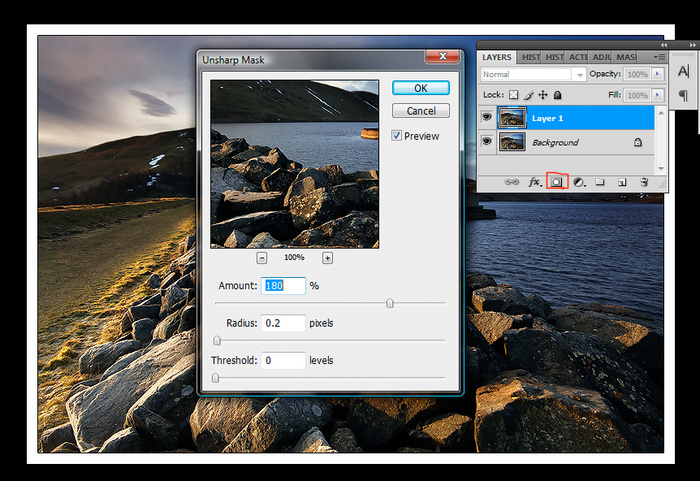 Now go to Filter-Sharpen-Unsharp Mask and use the settings: Amount 180%, Radius 0.2pixels, Threshold 0 levels (fig 2).