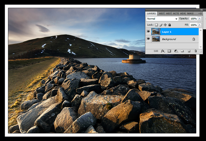 The good thing about having done the sharpening on a separate layer is that you can use a Layer Mask to paint back any area of the image if it looks over sharpened like the horizon, which might get a halo along it or an area where you want it to look a bit soft.