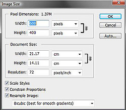 Have the dimensions set to Pixels and I usually have the longest edge set to 600px with the Resolution set to 72 pixels/inch. This will be set around 300 pixels/inch when printing but as it's just for the web this is fine and it helps stop your work from getting printed.